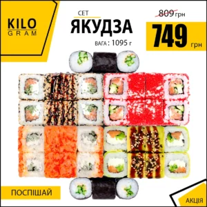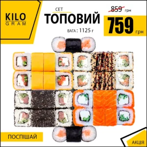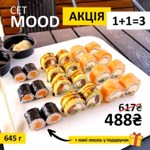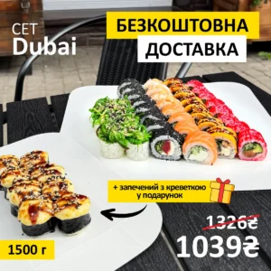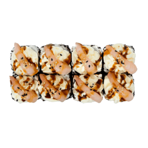 275 гСклад: васабі, імбир, креветка, крем-сир, кунжут микс, лосось копчений, норі, рис, соєвий соус, соус унагі, тобіко чорна