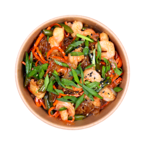 320 гзелена цибуля, креветка Тигрова, кунжут, морква, соус Теріяки, спаржа, устричний соус, фунчоза, цибуля