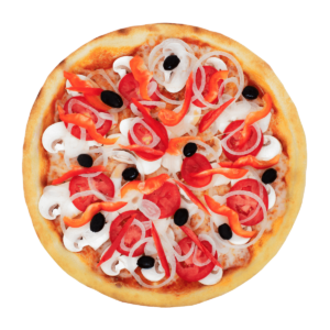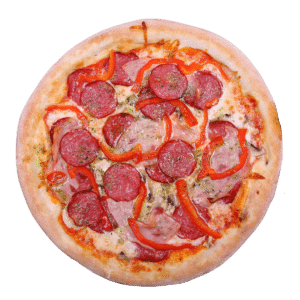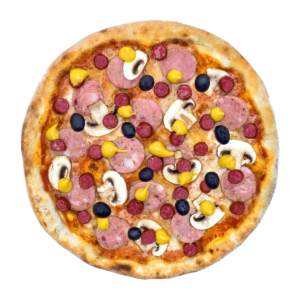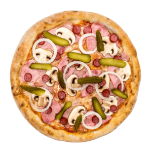 30 смСклад: бекон, ковбаски мисливські, корнішони, маринована цибуля, моцарелла, перетерті томати, печериці, шинка