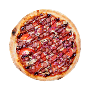 30 смСклад: бекон, ковбаски домашні, маринована цибуля, моцарелла, перетерті томати, помідор, часниковий соус