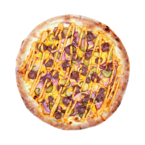 30 смСклад: бекон, гауда, корнішони, розовий соус, чеддер, червона цибуля, яловичий фарш
