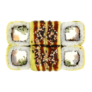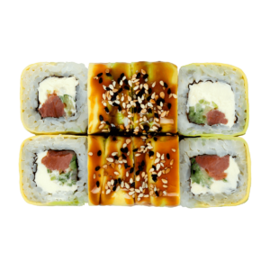 280 гСклад: авокадо, васабі, вугор, імбир, крем-сир, кунжут микс, норі, огірок, рис, соєвий соус, соус унагі, тобіко чорна