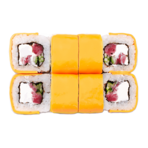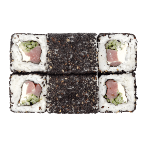 250 гСклад: васабі, імбир, крем-сир, кунжут чорний, норі, огірок, рис, соєвий соус, тунець, чеддер