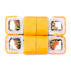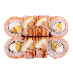 270 гСклад: васабі, горіх кеш'ю, імбир, крем-сир, лимон, лосось, манго, норі, рис, соєвий соус, соус кабаяки, соус унагі