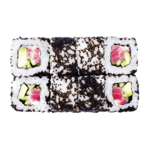 210 гСклад: авокадо, васабі, імбир, норі, огірок, рис, соєвий соус, тобіко чорна, тунець, японський майонез