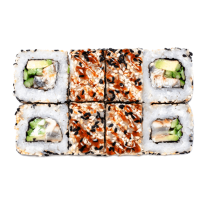 240 гСклад: авокадо, васабі, вугор, імбир, кунжут микс, норі, огірок, рис, соєвий соус, соус унагі, японський майонез