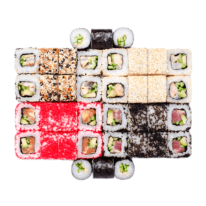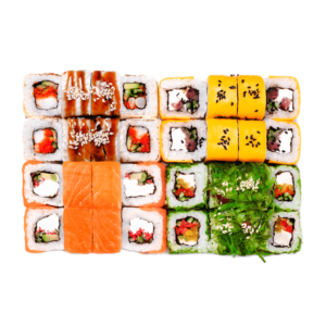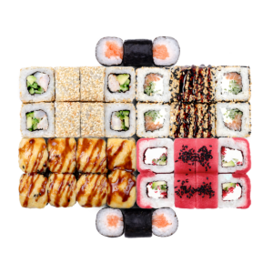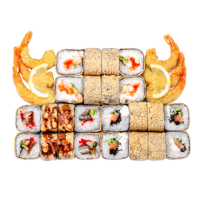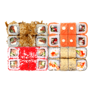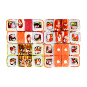 1120 гСклад: Авокадо з креветкою, васабі, Золотий дракон, імбир, Каліфорнія тунець, Маки з копченим лососем, соєвий соус, Філадельфія лосось Де-Люкс