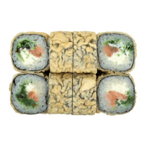 285 гСклад: васабі, імбир, крем-сир, лосось, норі, рис, соєвий соус, сухарі панко, темпура, чука