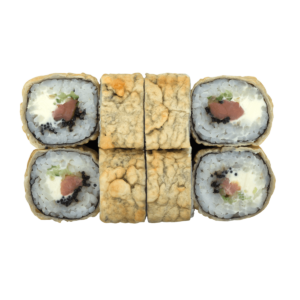 280 гСклад: васабі, імбир, крем-сир, лосось копчений, норі, огірок, рис, соєвий соус, сухарі панко, темпура, тобіко чорна