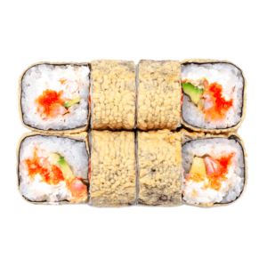 275 гСклад: авокадо, васабі, імбир, креветка, крем-сир, масаго, норі, рис, соєвий соус, сухарі панко, темпура