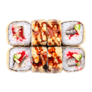 280 гСклад: авокадо, васабі, вугор, імбир, кунжут білий, лосось, норі, огірок, рис, соєвий соус, соус горіховий, соус унагі, тигрова креветка, тобіко мікс, тунець