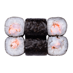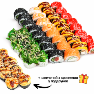 275 гСклад: васабі, імбир, креветка, крем-сир, кунжут микс, лосось копчений, норі, рис, соєвий соус, соус унагі, тобіко чорна