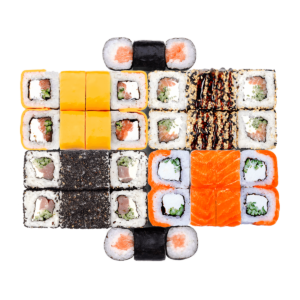 1125 гСклад: васабі, імбир, Маки лосось, Сирний з лососем, соєвий соус, Филадельфия Тунец, Філадельфія класична, Філадельфія Прованс