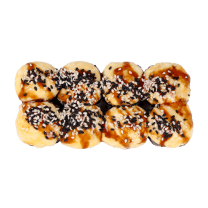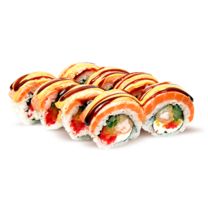 280 гСклад: васабі, гауда, імбир, крем-сир, норі, огірок, смажений лосось, соєвий соус, соус унагі, японський майонез